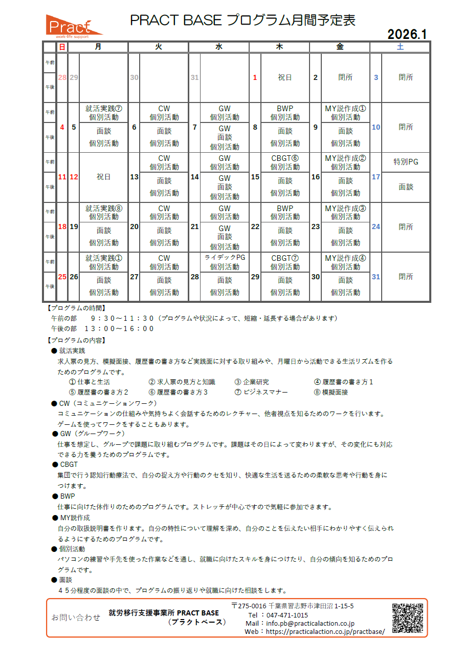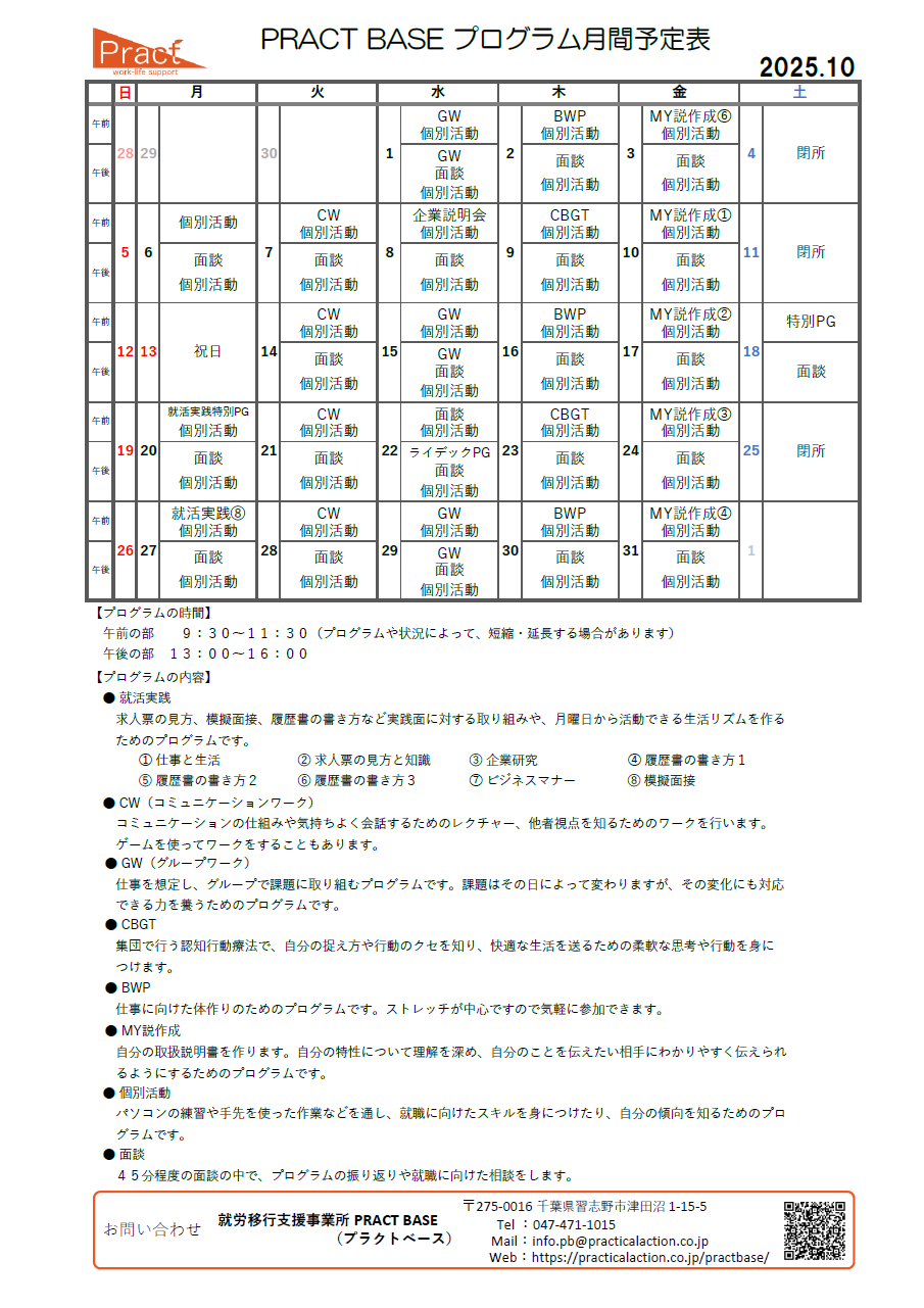 就労移行支援事業所 PRACT BASEのご案内パンフレット、及び月間プログラム表となります。ご不明点、詳細につきましては、お問い合わせください。 (プログラムやその他記載内容等、予告なく変更される場合がございます。予めご了承ください。)