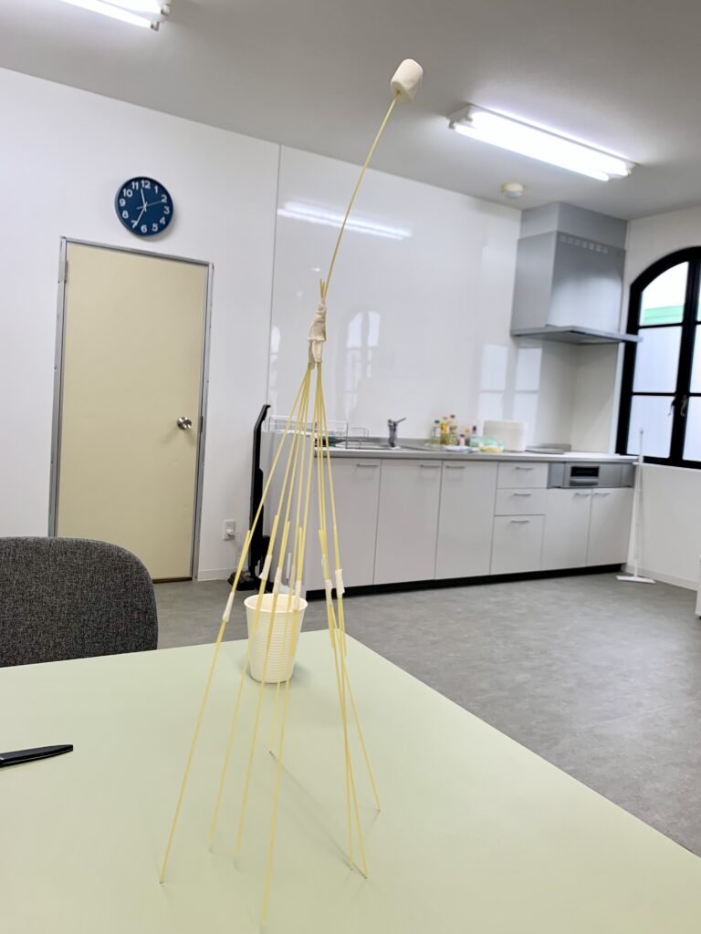 2022年12月8日 最近のラボ マシュマロチャレンジ! TWEET MAIL COPY LINK 先日、かかわり研究のプログラムでマシュマロチャレンジを行いました! マシュマロチャレンジは、チームに分かれて、パスタ・テープ・紐・マシュマロを使ってできるだけ高いタワーを作るゲームです。 最初は皆さん、「どういうこと?」という感じでしたが、始まってみると、「こうしたらどう?」など意見が出ていたり、協力してパスタを支えたりと、たくさんの関わりができました! 今回は2チームに分かれて行い、 記録はそれぞれ44cmと66cm!個性的なタワーが完成しました!皆さんお疲れさまでした☺︎